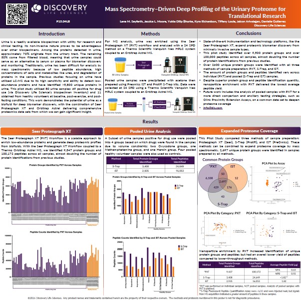 Urine is a readily available biospecimen with utility for research and clinical testing. Its non-invasive nature proves to be advantageous over other biospecimens. Among the proteins detected in urine, approximately 70% originate from the urinary tract. The remaining 30% come from filtered blood, meaning that urine samples could serve as an alternative to serum or plasma for biomarker discovery and monitoring. Traditionally, urine has been difficult for analysis by mass spectrometry because of low peptide abundance, high concentrations of salts and metabolites like urea, and degradation of proteins in the sample. Previous studies focusing on urine have utilized LC-MS due to its high sensitivity and ability to detect low-abundance proteins and have identified >5,800 unique proteins in urine. This pilot study utilized 80 urine samples: 69 positive for drug use (via Discovery Life Science’s biospecimen inventory) and 11 obtained from healthy volunteers at baseline, post-exercise, and post-fasting conditions. This work demonstrates the potential of urine as a biofluid for deep biomarker discovery, with the combination of Seer Proteograph XT and Orbitrap Astral delivering comprehensive proteomics data sets from which we can gain significant insight.